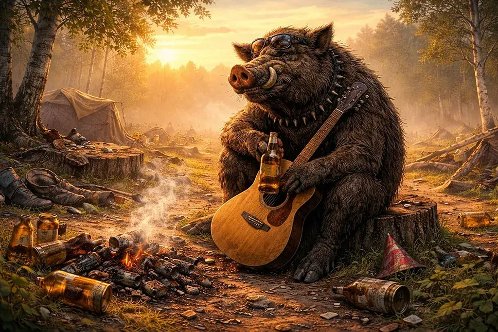 Корпоратив завершился феерично. Кабаны ушли, прихватив с собой гитару, половину шашлыков и, как утверждают свидетели, чужую бейсболку с логотипом радиохолдинга — как будто это был их корпоратив и они просто отработали смену.